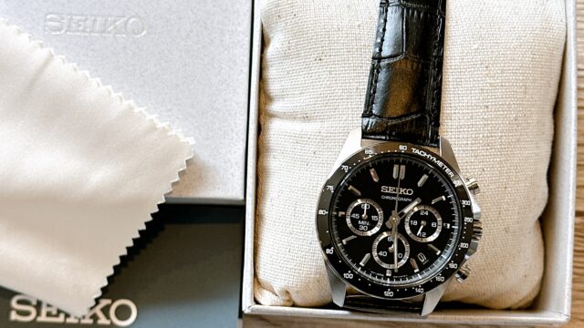 SEIKOの人気クロノグラフSBTR021を実機レビュー。ブラック文字盤と立体インデックスが生む高級感や、10気圧防水・クォーツの使いやすさを写真付きで解説。1万円台で買えるコスパ最強モデル。